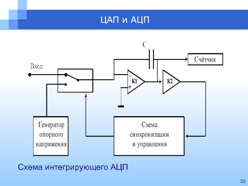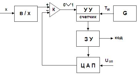 Схема работает следующим образом. Входной аналоговый сигнал Х перед началом преобразования запоминается схемой выборки – хранения (В/Х), что необходимо, так как в процессе преобразования необходимо фиксировать значение аналогового сигнала. Сигнал с выхода схемы выборки – хранения подается на один из входов компаратора, на второй вход которого подается сигнал с выхода ЦАП. Состояние ЦАП определяется кодом, хранящимся в запоминающем устройстве (ЗУ), а этот код соответствует в свою очередь состоянию счетчика, входящего в состав устройства управления (УУ).