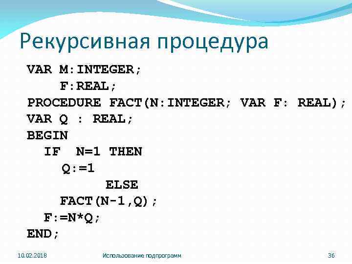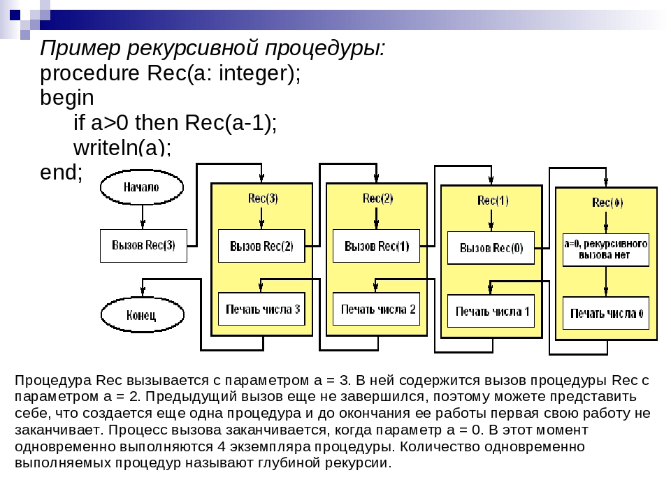 Рекурсивной называется процедура, в которой имеется обращение к самой к себе.